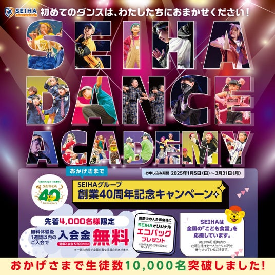 株式会社セイハダンスアカデミー(福岡県福岡市,代表取締役:坂口 正美,以下セイハネットワーク)は、セイハグループ全ブランド対象に「セイハ創業40周年」のキャンペーンを開催しております。お客様への感謝の気持ちを込めて、セイハダンスアカデミーでは、先着4,000名様限定入会金無料とさせていただきます。しかも今なら、期間中の入会者全員にSEIHAオリジナルエコバックプレゼント!是非、この機会にダンスを始めましょう✿初めてのダンスはセイハにお任せください。