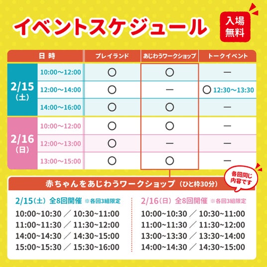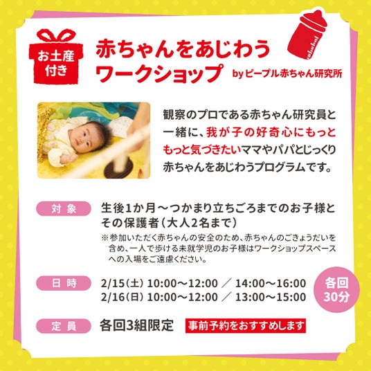 ※参加いただく赤ちゃんの安全のため、赤ちゃんのごきょうだいを含め、一人で歩ける未就学児のお子様はワークショップスペースへの入場をご遠慮ください。