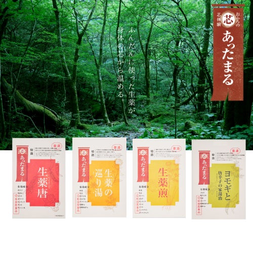 【芯まであったまる】生薬をふんだんに使い、有効成分をバランスよく配合した医薬部外品の入浴剤シリーズです。生薬の湯けむりをゆっくり深く吸い込んで、心地よい発汗とともに芯まで温まります。