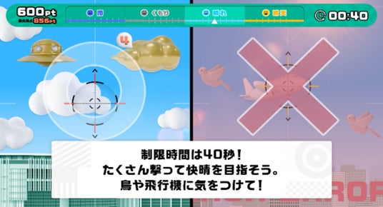 画面に現れる雨雲や金色の雲、UFOを狙うクレー射撃ゲームです。雨雲は中心を撃つと高得点、金色の雲やUFOを撃破すればボーナスポイントが得られます。一方で、鳥や飛行機を撃つと減点されるので注意が必要です。最後の10秒間は大量の雲が現れるボーナスタイムで大逆転のチャンス!素早い判断と正確な狙いが勝利の鍵です。