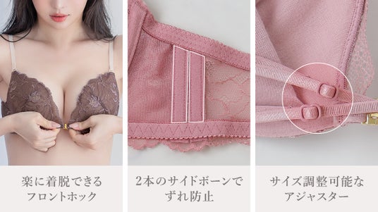 機能性だけでなく、デザイン性も兼ね備えた”ピオニーレースフロントホックブラ”。バレンタインにもピッタリの「ミルクティー」「スイートピンク」「ショコラブラウン」の可愛らしい3色が登場します。フロントホックタイプのブラには珍しいアンダー調節機能を採用しており、長時間の着用でもストレスを感じさせず、体にやさしくフィットします。
