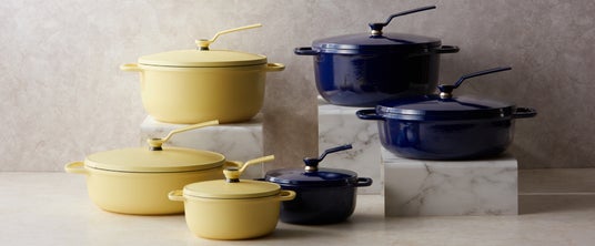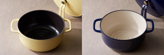今回のコラボレーションでは、バーミキュラの鋳物ホーロー鍋「オーブンポット2」を、BECCIU. ECサイト限定のオリジナルカラーで販売いたします。カラーは、どんなテイストのキッチンにも馴染むオーシャンネイビーと、少し遊び心を感じられるマットカモミールイエローをご用意いたしました。明るいイエローの内側には締め色のブラックを、そして落ち着いたネイビーの内側にはお料理を華やかに見せてくれる柔らかなベージュを掛け合わせました。バーミキュラファンからもリクエストの多かったカラーです。