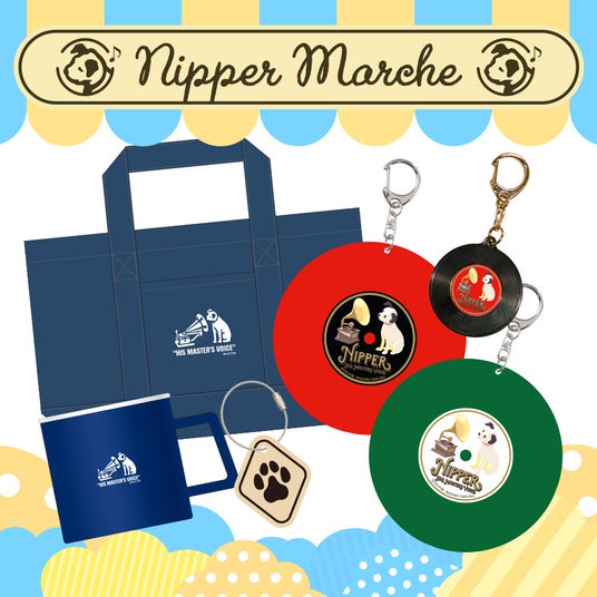 ニッパー陶器置物やスマホスタンドスピーカーなどの定番商品や、ロゴを使用したトートバッグやマグカップ、またニッパーの絵本「NIPPER -His Master’s Voice-」の絵柄を使用したキーホルダーやコースターなど取り揃えております。ニッパーの魅力が伝わるマルシェとなっておりますので、お越しの際には是非お立ち寄りください。