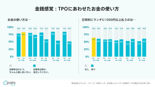 お金の使い方で「お財布は別々」と回答した新成人の女性が82.1%で男性を上回ったほか、女性間比較でも2位に9.1%差の結果に。一方で日常的に、ランチに1000円以上払う価値観は世代間に大きな差が見られなかった。