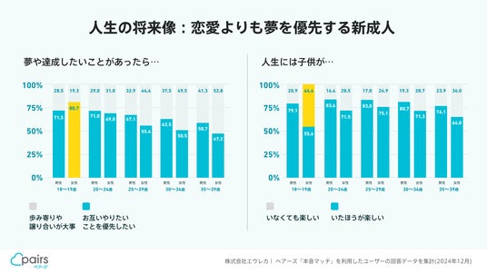 新成人の女性は、夢や達成したいことがあったら「やりたいことを優先」する現実的な恋愛関係を求める回答、人生には子供が「いなくても楽しい」と回答し、全世代・男女別でそれぞれ1位に。