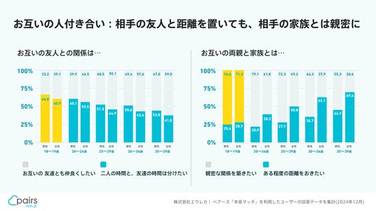 「お互いの友人との関係は…」の質問で「ふたりの時間と、友達の時間は分けたい」との回答割合が、新成人の男女が全世代・男女別で1位(男性:66.8%)、2位(女性:60.9%)「お互いの両親や家族とは…」の質問では友人関係と逆の回答結果。