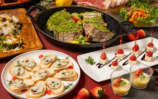 苺とショコラを主役としたメニューのほか、フードロス削減やプラントベースフードなどを取り入れたメニューなど、さまざまなビストロフレンチブッフェをお楽しみいただけます。