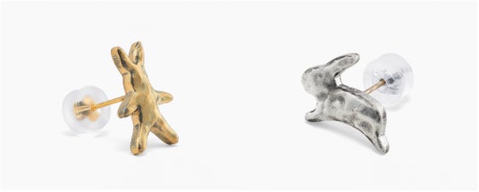 まるでコインから飛び出てきたような小さなウサギやニンジンがモチーフになったジュエリー。コインに刻まれた絵柄をそのまま型抜きしているため、裏面のデザインも魅力。チャームは付属のフープでピアスとして身につけたり、お好きなチェーンや革紐などを通してペンダントにしたり、何通りにも自由にアレンジしてお楽しみいただけます。