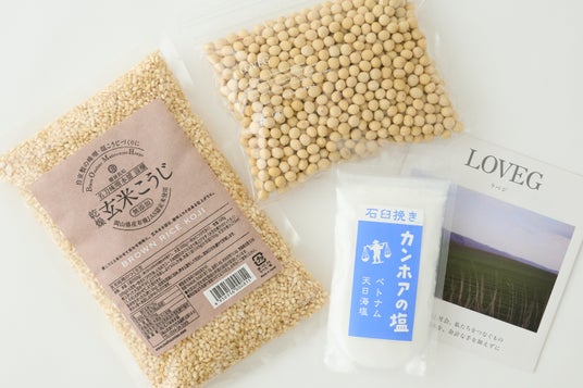 乾燥玄米こうじ、有機丸大豆、天日海塩がセットになった「手前味噌つくりキット」 ¥3,980