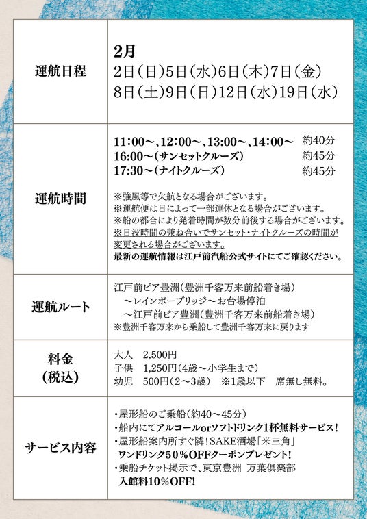 乗船チケット掲示で、「東京豊洲 万葉倶楽部」入館料が10%OFFに
