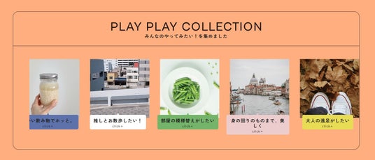 みんなの「今のやってみたい」を集めたコーナーです。「推しとお散歩したい」「身のまわりのものまで、美しくしたい」など、いろんな人の視点から見ることで、世界が広がったり、新たな発見があったり。私は何をしたいんだろう?と、自分にぴったりなあそび(PLAY)を見つけられそうです。