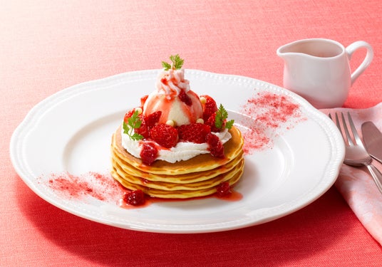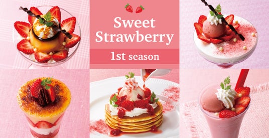 1stシーズンでは例年大好評の「苺のブリュレパフェ」のほか、昨年初登場し好評だった「苺のプリン・ア・ラ・モードパフェ」、ショートケーキをグラスに盛り込んだ「苺のふんわりショートケーキ仕立て」が装いを新たに登場。さらに、苺デザートでは初となる「苺みるくのスムージー」をご用意しました。苺みるくの濃厚な甘さとベリームースや苺の酸味が混ざりあう一品です。また、ちいさめの「パンケーキ」を4枚重ね、上にバニラアイスクリームや苺を合わせた「とろけるバニラアイスクリームの苺パンケーキ」は、午後のひとときにもおすすめの一品です。