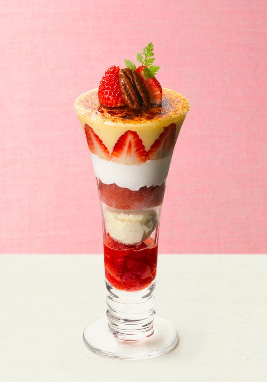 カリッと香ばしくキャラメリゼしたクレームブリュレに甘ずっぱい苺の味わいと、ピーカンナッツのアクセント。様々な素材が織りなす見た目にも楽しいパフェです。