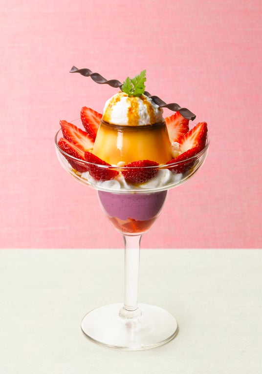 まろやかなプリンに、塩キャラメルアイス、 ほんのり甘ずっぱいベリームースを合わせた、苺とプリンを存分に楽しめる贅沢なプリン・ア・ラ・モードパフェです。