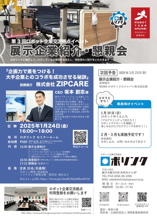 こども向けイベント「プログラミングって何だろう!(企画:ロボットゆうえんち)」、ロボット関連企業向けイベント「展示企業紹介(株式会社ZIPCARE)・懇親会」を開催します!