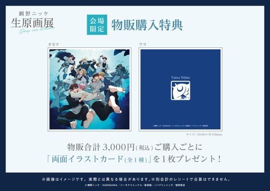 イベントオリジナルグッズ「メモリアルブック [1,650円(税込)]」をマンガ展ストアorイベント会場でご購入頂いたのち「抽選フォーム」からご応募いただくと、抽選で2名様に、鯛野ニッケ先生描き下ろし色紙をお届けいたします!