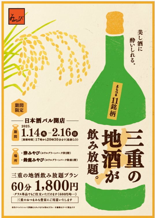 株式会社グリーンズ(本社:三重県四日市市、代表取締役社長:村木雄哉、証券コード:6547)は、運営するホテルグリーンパーク津2階「津みやび」とホテルグリーンパーク鈴鹿1階「鈴鹿みやび」にて、日本酒をテーマにした特別イベント「日本酒バル」を開催いたします。本イベントは、三重県が誇る地酒と食材を多くの方にご賞味いただき、三重の魅力をお届けすることを目指しています。三重県内の33の蔵元が所属する酒造組合から選りすぐりの地酒を提供し、地域のファンを増やすきっかけをつくります。