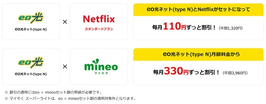なお本サービスは、固定電話(eo光電話(type N))や動画配信サービス(Netflix)とのセット利用に加えて、携帯電話サービス(mineo)とのセット割引にも対応しておりますので、お客さまのニーズに合わせて選択いただけます。