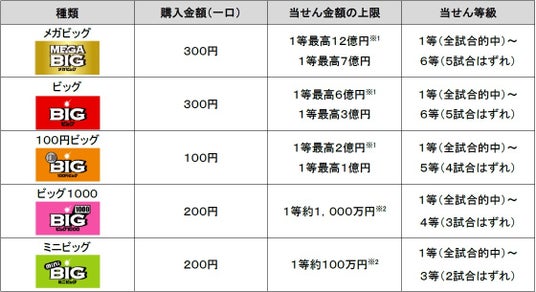 最高当せん金額や購入金額によって異なる5種類のBIGがあります。