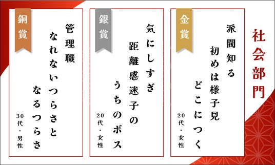 金賞作品の「派閥知る 初めは様子見 どこにつく」は、総裁選や裏金問題など、社会人の注目を集めた”政治”が職場でも行われている様子が”派閥”というワードから想起され、戸惑いとともにリアルを感じさせる内容として選出されました。