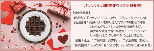 今回の商品は、“バレンタイン”がテーマ。北海道産発酵バターを練り込んだワッフル生地に特製のダマンドショコラを絞り、焼き上げました。ワッフル生地と重ねたダマンドショコラのサクッとした食感をダブルで楽しんでいただけます。また、ワッフル生地に重ねたショコラの色味とトッピングしたドライクランベリーの赤が見た目も楽しめます。11/25から販売している包餡タイプの「ショコラオランジュ」と一緒に、大切な人に感謝の気持ちを添えてお届けしてみては・・・