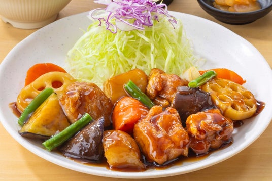 不動の人気NO.1メニュー!玄米黒酢と黒糖に、りんご酢で味を調えた、大戸屋オリジナルの黒酢あん。ごろっと大きな野菜とお肉で大満足の一品です。