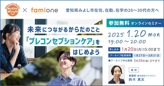 「子どもを願うすべての人によりそい 幸せな人生を歩める社会をつくる」をビジョンに掲げ、法人の従業員向け福利厚生や自治体の住民向け支援を行うヘルスケアサポートサービス「ファミワン」 https://famione.com/benefit/ などを展開する株式会社ファミワン(本社:東京都渋谷区、代表取 締役:石川 勇介、以下当社)は、愛知県みよし市(市長:小山 祐、以下みよし市)の在住、在勤、在学 20代~30代の方を対象に2025年1月20日(月) 「未来につながるからだのこと 『プレコンセプションケア』をはじめよう」をテーマにオンラインセミナーを開催いたします。