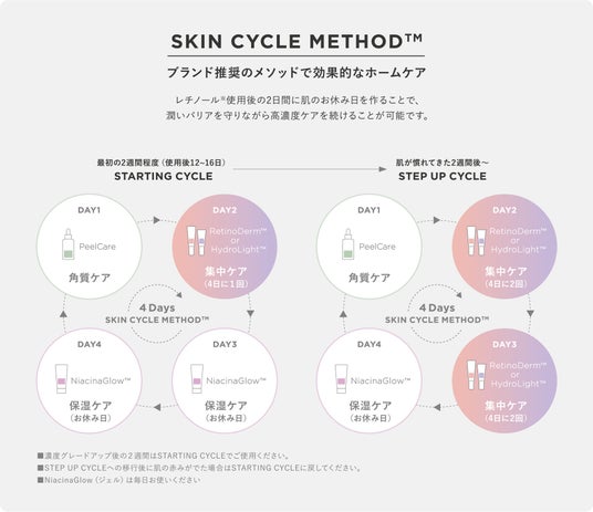 肌荒れを起こしにくく、より効果的にレチノール*を使う方法としてアメリカを中心に世界的に流行しているスキンケア方法を、日本人の肌に合うようにアレンジしたのがSKN REMEDの【Skin Cycle Method(TM)】です。