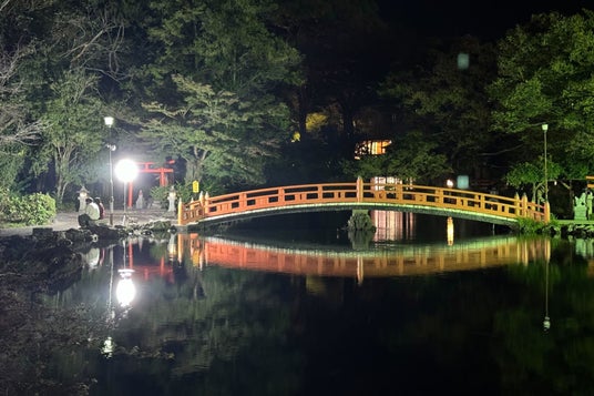 人が集まる夜の湧玉池