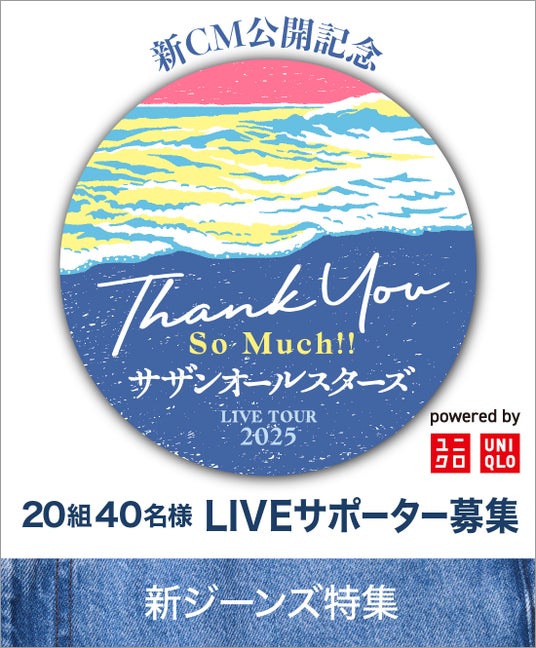 サザンオールスターズがCM撮影時にユニクロについて語ったコメント映像の初公開や、現在開催中の全国ツアー“サザンオールスターズ LIVE TOUR 2025 「THANK YOU SO MUCH!!」 powered by ユニクロ” LIVE サポーター参加券を含む視聴者限定プレゼント企画もご用意しています。