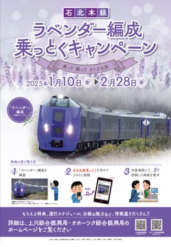 オホーツク総合振興局と管内JR石北本線沿線自治体※では、JR北海道の特急車両ラベンダー編成が石北本線を運行する1月10日(金)から2月28日(金)の期間中、鉄道の利用促進と沿線市町の活性化を目的として、JR北海道などの協力のもとキャンペーンを実施しています。