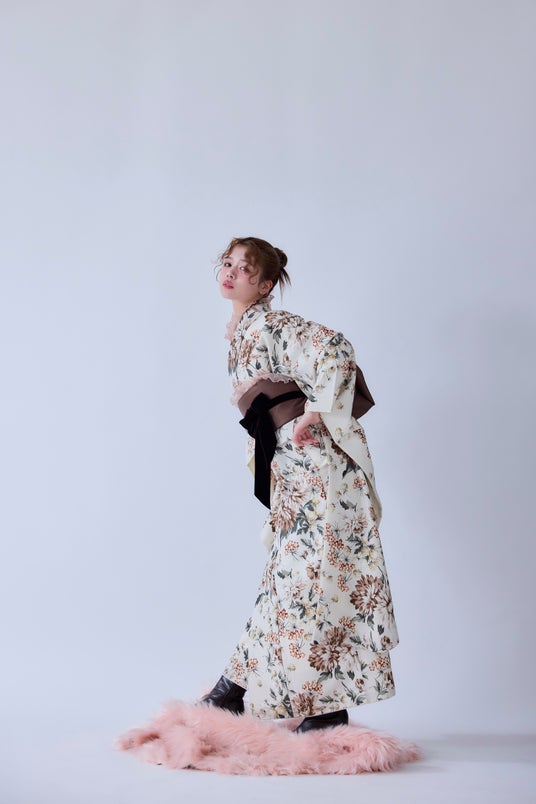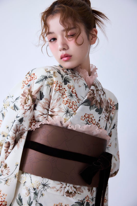 襟、帯、袖に入ったキュートなフリルと腰紐のリボンでファッショナブルなコーディネートに。