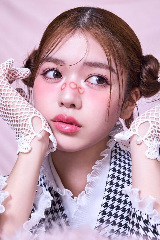 メイクはぽってりとしたチークとオーバーリップでキュートなピンクメイクを合わせて