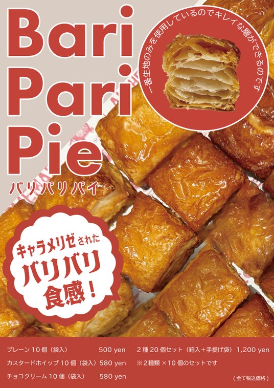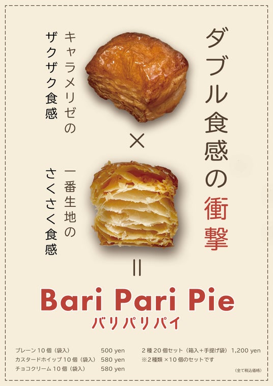 ザクザク食感のキャラメリゼと、さくさく食感の一番生地が織りなす極上のハーモニーが実現。一番生地のみを使用することで実現した美しい層とキャラメリゼの絶妙な甘みと香ばしい風味が特徴の新感覚スイーツ「Bari Pari Pie(バリパリパイ)」が登場しました。