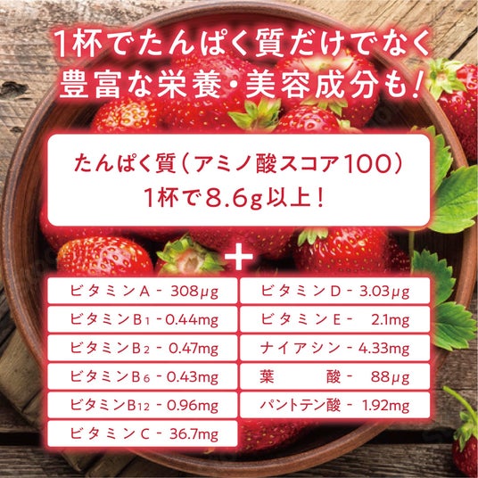 し、アミノ酸スコア100のホエイプロテインと1食分のビタミンを配合しており、身体づくりにも良い構成となっております。