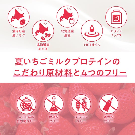 北海道の夏いちごとあずきの贅沢なフレーバーを、この機会にお楽しみください。「美味しいから続けられる」プロテインで、健康と地域支援をサポートします!