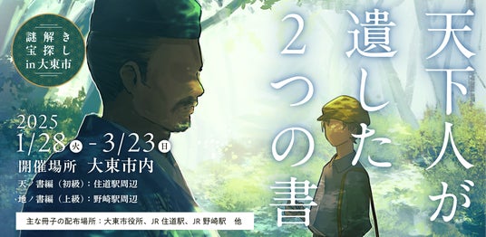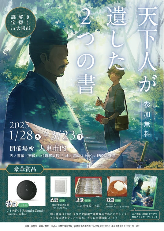 謎解きサイト「アソビプラネット」の運営や謎解き制作を手がける株式会社IKUSA(本社:東京都豊島区、代表取締役:赤坂大樹)は、2025年1月28日(火)~2025年3月23日(日)まで大阪府大東市内にて周遊型謎解き「天下人が遺した2つの書」(主催:大東市)を企画運営いたします。