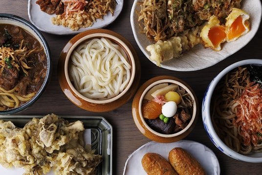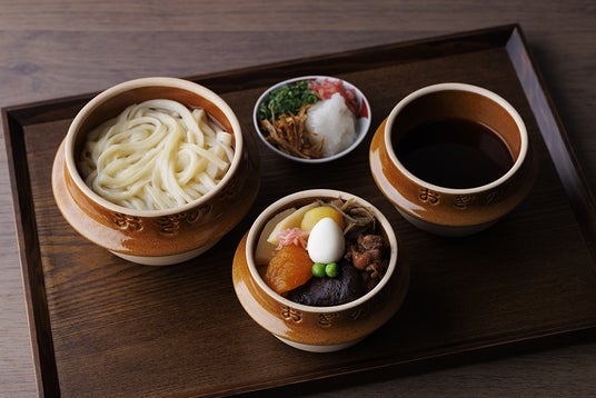 伝統の出汁とかえしを活かしたメニューには、上州牛の牛すじを煮込んだおでんや、荻野屋定番料理をラインナップ。うどんは「温かけ」「冷つけ」「ぶっかけ」「汁なし」の4種、計10種類以上を用意しました。『峠の釜めし』の具材を使用した「峠のかき揚げうどん」をはじめ、ボリューム満点の「肉盛りうどん」、海老の旨味が凝縮した「海老まぜうどん」、「上州牛の牛すじカレーうどん」など、毎日飽きずに楽しめる味わいを追求しています。