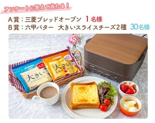 今回は、抽選で31名様に三菱ブレッドオーブンまたは六甲バター チーズセットをプレゼント! 三菱ブレッドオーブンは、食パン内の水分と香りを庫内から逃さず焼く独自の構造で、一枚をじっくり丁寧に焼き上げます。食パンの耳ギリギリまで美味しくチーズを味わえる六甲バターの大きいスライスチーズをのせて、ふんわり美味しいチーズトーストを楽しんでみてくださいね。ふるってご応募ください♪