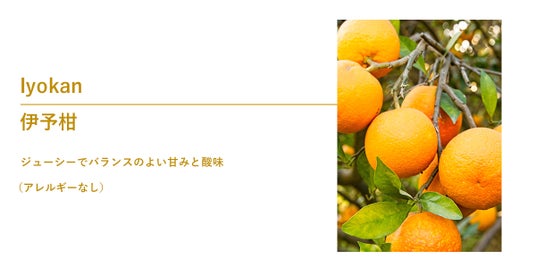 MOTTAINAI FARM様からご提供いただく愛媛県産の伊予柑を使用。果肉が柔らかくみずみずしい味わいで、絶妙なバランスの甘酸っぱさと芳醇な香りが特徴。独自の非加熱製法により、フレッシュフルーツそのままの風味を体験できる“生フレーバー”です。