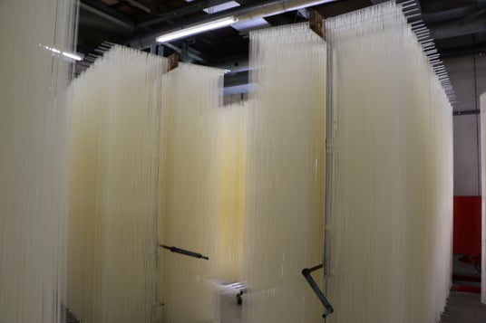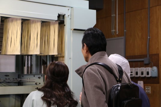 特別に、製造現場を見学させていただきます。麺がどんどん延ばされます!