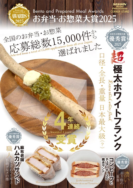 また、日進ワールドデリカテッセンは、お弁当・お惣菜大賞への初参加より4年連続で優秀賞を獲得しており、今回は、パン部門で「日本最大(?)の超極太ホワイトフランク」が優秀賞を受賞しました。