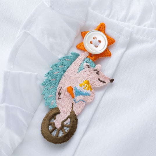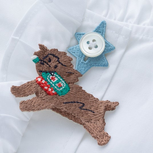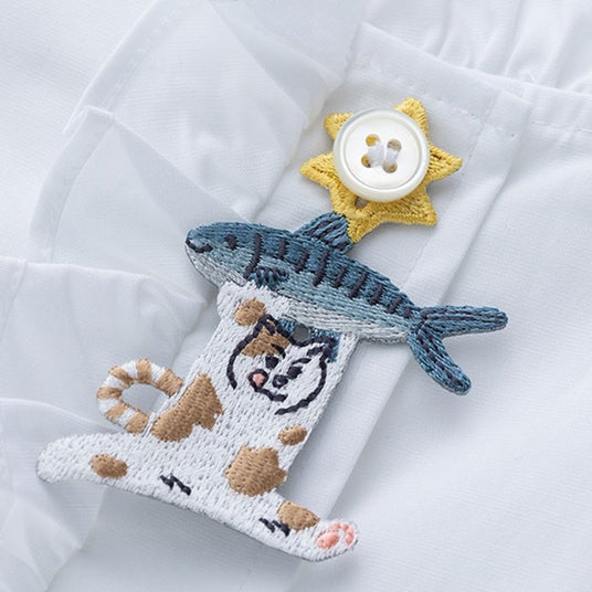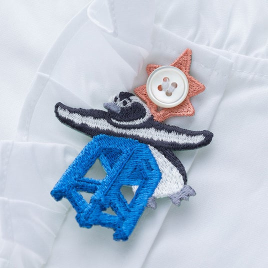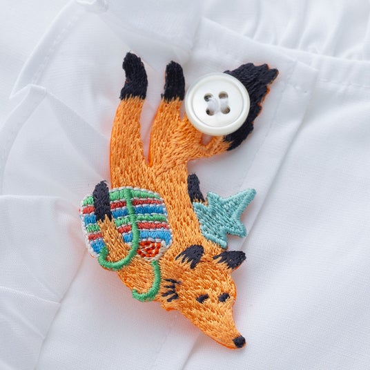 ボタンフックとは刺繍したモチーフにボタンホールをあけ、シャツボタン程度の大きさのボタンになら、どこにでもつけることが出来るアクセサリー。