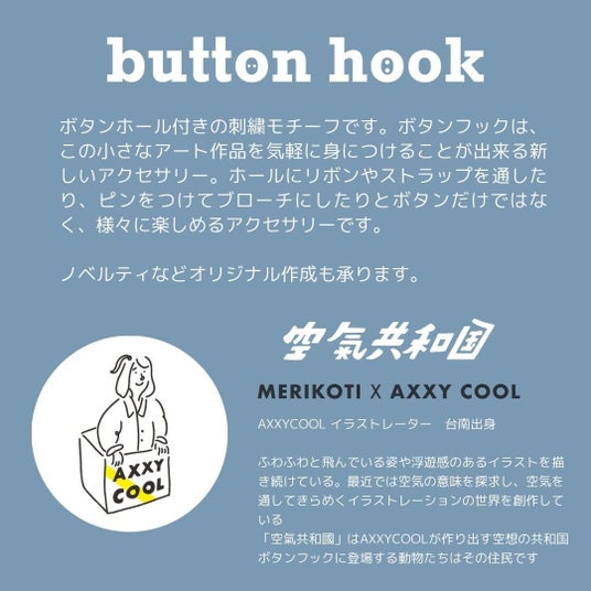 「空気共和国」はAXXY COOLが作り出す空想の共和国、ボタンフックに登場する動物たちはその住民です。