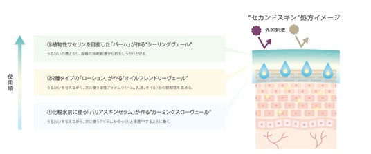 バリア機能が低下しはじめている肌に、まるで擬似的な皮膚のような3つのヴェールを作り、心地よくうるおいを与えながら刺激による反応を和らげ、乾燥などの外的刺激をしっかりと防いでトラブルの進行にブレーキをかけます。