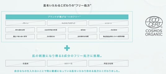 エッフェオーガニックのブランド共通開発基準である「11のフリー」に加えて、リペアカーミングシリーズではゆらいでいる肌にとって刺激となり得る3つの成分「防腐剤」「エタノール」「界面活性剤」もフリーで処方を開発しました。