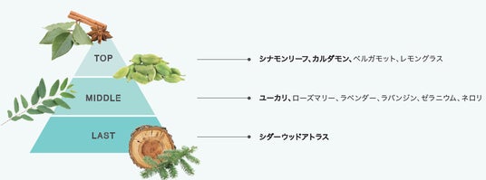 シナモンリーフ、カルダモンのスパイシーさにすっきり感のあるユーカリやローズマリー、リラックス感の高いラベンダーやゼラニウムを重ねて、ベルガモットやネロリで明るさと爽やかさを。