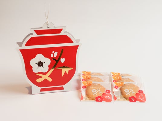 ふわりと香るバターの風味の“赤”と、名古屋名物のあんバターをイメージした“金”の2種類のお椀の形のクッキーです。