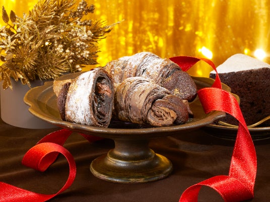 「プレミアムチョコクロ 濃厚リッチガトーショコラ」は、かつてサンマルクカフェの一部店舗にて販売し好評を博した「ガトーショコラチョコクロ」を進化させたチョコクロ。しっとりふわふわなガトーショコラフィリングと濃厚でなめらかなガトーショコラそのものを、チョコレートを練り込んだ生地で包み焼き上げた商品です。食感や味わいの異なる2種のガトーショコラを一度にお楽しみいただける、バレンタインにピッタリの商品が誕生しました。表面に振りかけた粉糖や金箔がよりガトーショコラらしさや華やかさを演出します。