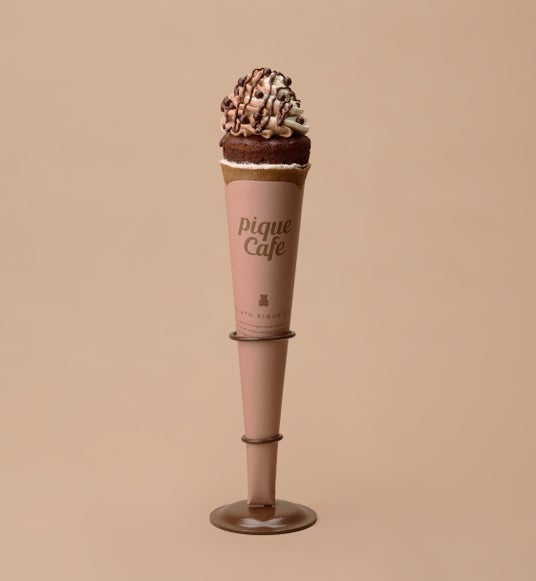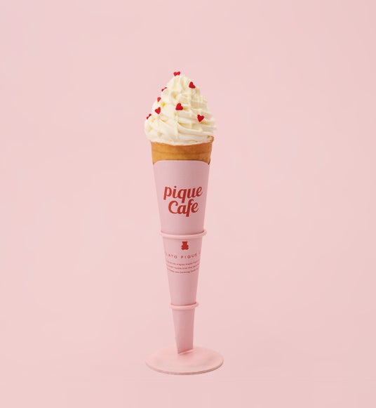 ホイップの下にはラズベリーとホワイトチョコレートを織り交ぜたピケカフェオリジナルのジェラートを隠し、生地の中にはイチゴとラズベリー2種のソースを使った甘酸っぱさが心地よいクリームと、香ばしい全粒粉ビスケットを包んでいます。